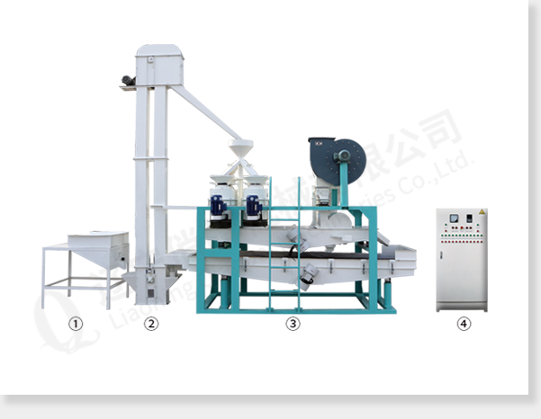 ①input hopper ②bucket elevator ③main part of the equipment(dehullers, air separator,and seed-kernel separator) ④electric control cabinet