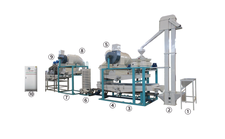 ①приёмный бункер ②ковшовый элеватор ③главная машина (шелушитель, вибросито для удаления шелухи и вибросито для сепарации нелущённой семечки и ядра)④рессорный транспортёр ⑤вертикальное пневматическое устройство ⑥спиральный элеватор ⑦ вибротранспортный ветросепаратор ⑧вертикальное пневматическое устройство ⑨электростатический ветросепаратор ⑩электрический управляющий шкаф